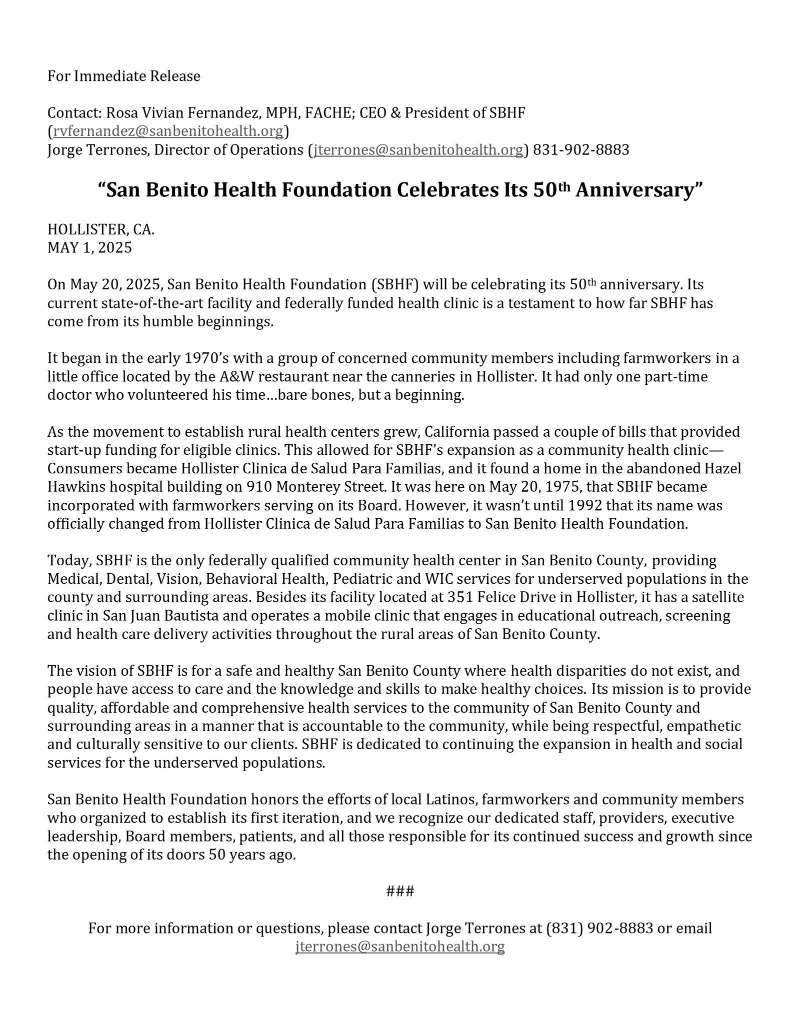 San Benito Health Foundation Celebrates Its 50th AnniversaryOn May 20, 2025, San Benito Health Foundation (SBHF) will be celebrating its 50th anniversary. Its current state-of-the-art facility and federally funded health clinic is a testament to how far SBHF has come from its humble beginnings.